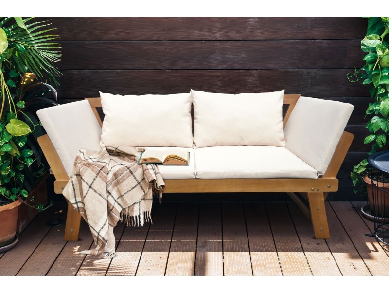 Réinventez vos extérieurs avec ce magnifique canapé KERATON ! Sur une terrasse, sur un balcon ou dans un jardin, il vient occuper l’espace avec chic et élégance. Sa structure est en bois d’acacia certifié FSC ce qui assure une gestion durable des forêts. Sa finition de couleur teck clair apporte de la luminosité à l’ensemble du meuble. Huilé et séché, ce canapé résiste parfaitement aux UV ainsi qu’aux intempéries. Des coussins moelleux et accueillants recouvrent l’assise et le dossier. Ils vous offrent un confort inégalable. Ils sont composés d’une mousse en polyuréthane d’une belle densité. Tres rapidement elle se transforme en un bain de soleil en rabattant ses accoudoirs